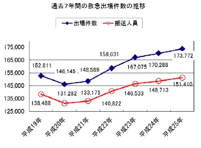 まず、2013(平成25)年中の横浜市内の救急出動件数は17万3772件で、最も多かった前年の2012(平成24)年から3484件増加し、過去最多となった。これを1日当たりの平均出動回数で計算すると476件で、3分1秒に1回の救急出動があったことになる。