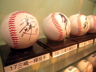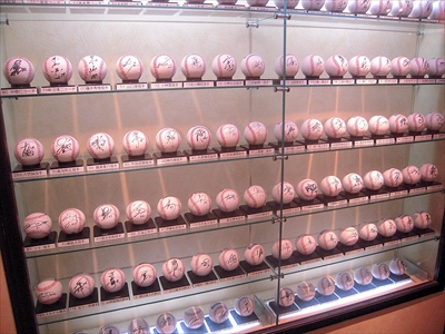 ガラスケースにサインボールがぎっしりと並ぶ。