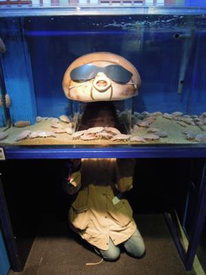場内には、底の方から頭を入れて「オオグソクムシ」を間近に観察できる水槽も設置されている。
