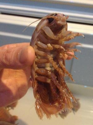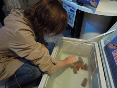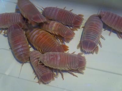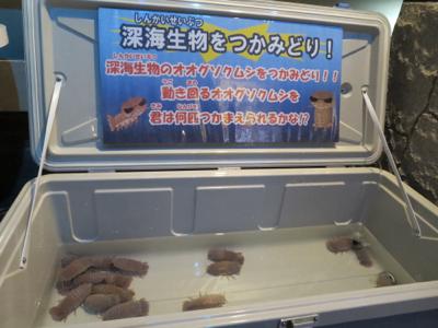 「深海ゾーン」の仲間たちは、国内で捕獲できない「ダイオウグソクムシ」以外、すべて名誉館長の長谷川さんの手によって捕獲されたもの。本日の食材ももちろん長谷川さんの提供。ではご登場いただこう。オオグソクムシさ〜ん!