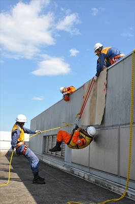 屋上へ着くと、「○○確認!!」「○○異常なし!!」といった掛け声が飛び交う。レンジャー訓練のひとつで、人を吊り上げる訓練。