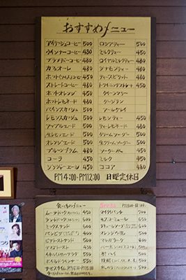 中に入って壁に貼られたメニューを見ると、アイリッシュコーヒーやウインナーコーヒーなどがならぶ。「あぁ、これは昔の喫茶店だ・・・」と遠い記憶がよみがえる。