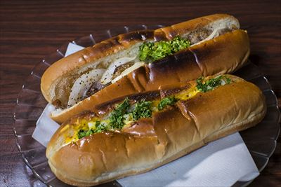 ムーサドッグは、ゆでタマゴを粗くつぶしてマヨネーズであえたものを挟んだドッグと、豚バラ肉にコショウを効かせて玉ねぎと炒めたものを挟んだドッグのセット。2つで450円と安いが、25年前から価格据え置きでやっているそう。