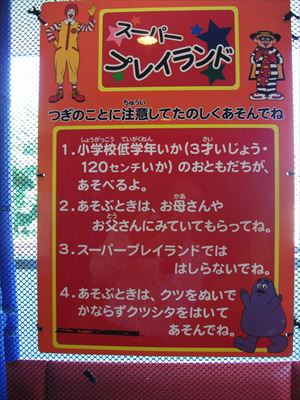 プレイランドで遊べる子どもの対象年齢は、危険防止のため3歳以上、小学生低学年(身長120cm)以下となっている。だいたい小学校3年生ぐらいまでが目安。遊具利用料は無料。利用条件(年齢・身長など)は店舗によって異なるそう。
