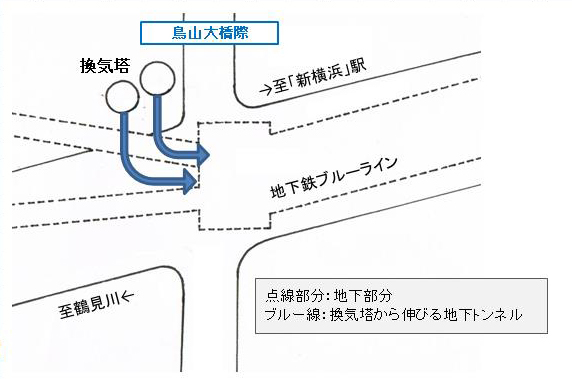 鳥山大橋の横にある2本の円柱状の建物は、横浜市営地下鉄の換気塔。給気・排気ができ、中はトンネルがあり地下鉄の線路の真上につながっていた