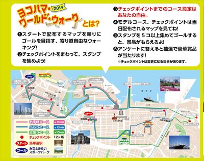 今年の9月14日に開催予定のヨコハマ・ワールド・ウォーク2014。みなとみらい線・馬車道駅をスタートとし、みなとみらいエリアをウオーキングしながらチェックポイントを回り、ゴールは横浜みなとみらいスポーツパークとなっている。チェックポイントにあるスタンプを5個以上集めると景品がもらえる、というもの。主催は市体協。
