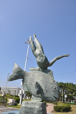 大きな魚に片手で倒立している、江ノ島漁港にある「海の詩」という銅像の意味がわからないので、知りたい。またモデルは本当こんな格好ができたのかな?(hozupiさんのキニナル)