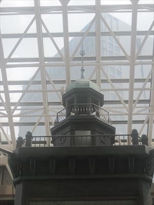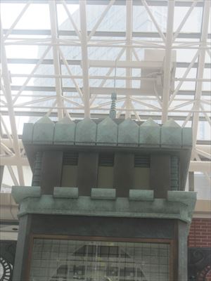 横浜駅東口。ポルタの入り口に大きなガラスのゲートがある。レンガを土台に直方体のガラスが門を模して三つ並び、キング(神奈川県庁本庁舎)、クイーン(横浜税関本庁舎)、ジャック(横浜市開港記念会館)のミニチュアを頂上に冠している。