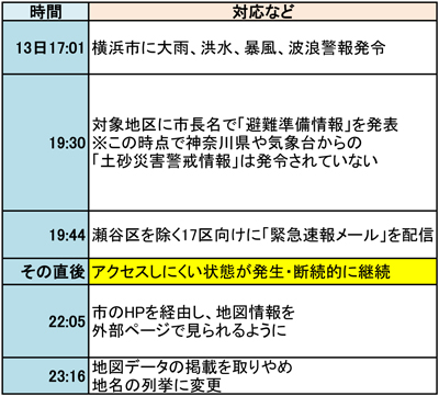 鈴木係長によると、雨のピークが13日深夜になるという気象台の予想などから、同時間帯に避難勧告を出しても安全に避難できない可能性があると判断し、13日午後7時30分に林文子市長名で「避難準備情報」を発令。