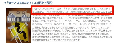 一般社団法人「日本セーフコミュニティ推進機構(JISC)」のホームページによると、『「セーフコミュニティ」とは、「すでに完全に安全な状態である」コミュニティでなはなく、「体系だった方法によって安全の向上に取り組んでいる」コミュニティのこと』とあるが、さっぱりイメージがわかない・・・