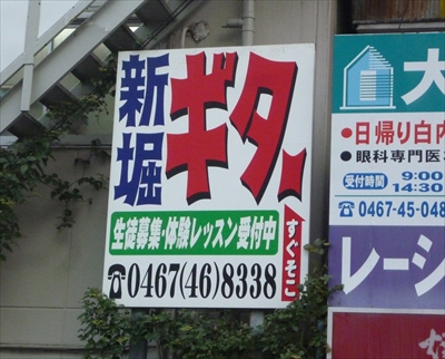 各地に「新堀ギター音楽院」をつくったら、そこに赴任した講師がご近所に挨拶に回りながら看板を貼ってくれるところを探します。探すというか・・・賛同してくれた方が、無料で貼ってくれているんです。