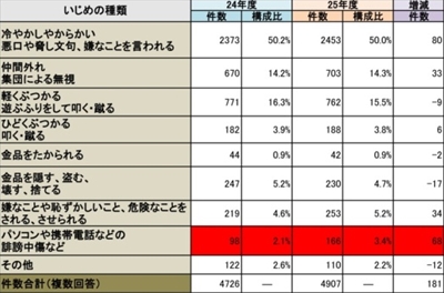 また、いじめの種類についても、大人が気付きにくい「悪口や嫌がらせ」「携帯電話などの誹謗中傷」が大きな割合を占めている。