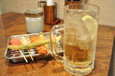 関西の串カツよりもしっかりとした厚めの衣に、二度漬け禁止のソースがしっかりとしみこむ。高温でカラッと揚がっているので油はあまり強く感じず、衣の食感、ソースの旨みがたまらなく美味い。定番の豚(100円)とキス(100円)は人気とのことです。