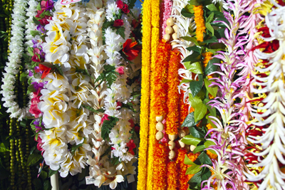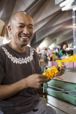 生花でレイを作る大谷幸生さん。同じ場所で生花の髪飾りを作っている場合もあるとか