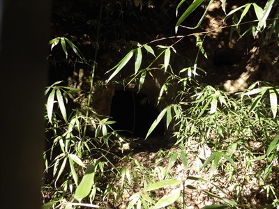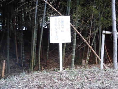 しかし・・・遺跡の痕跡らしきものは見つからない。深い洞窟も。一応見落としの無いように回ったつもりであるのだが。遺跡発掘現場の跡地だというのであれば、それらを説明するパネルがあっても良いだろうが、そういったものも見当たらない。見つかったのは竹の子泥棒を戒める看板と、洞窟と言うには若干無理のある穴。