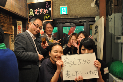 女性客2人組(後ろ右)と、常連の皆さん、そして鳥むすめスタッフのお二人(写真前)