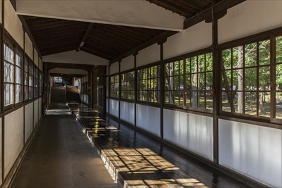 廊下の右側に敷かれた木は、窓を映すほど磨かれていた
