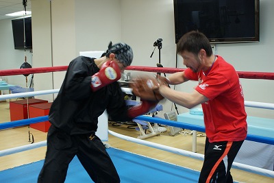 親子での練習風景。リング上でのミット打ちでは、どちらも真剣だ