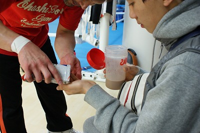 練習後は栄養士の指導の通り、アミノ酸などを補給する