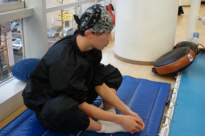 練習前のストレッチ中。真剣な眼差しでリングを見つめる圭佑くん