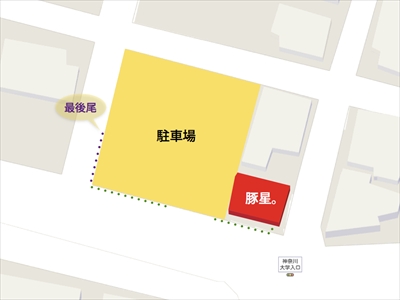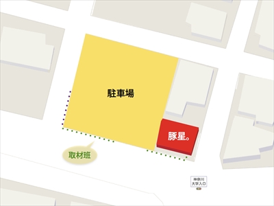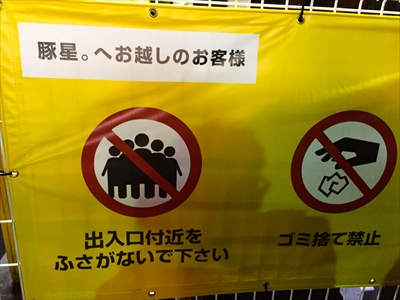 駐車場前を渡ったのはその約20分後であった。やはり日ごろから行列ができる店だけあって「豚星。」側のフェンスには、その部分だけを貼ったり書き足したりしたものではない、オリジナルで作成された横断幕がかけられていた。
