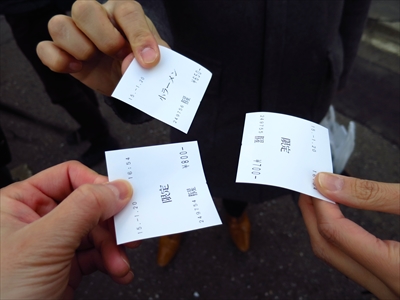 の3種類。われわれ取材班もちょうどよく3人だったので、列に並んでいる途中で食券を買いに行き、くじ引き方式で誰が何を食べるか決めることにした。