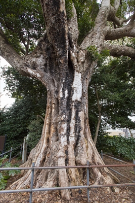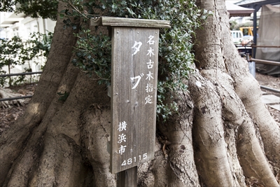 正面には、いくつものプレートがある。横浜市の名木古木指定だけでなく、横浜市指定天然記念物であり「かながわの名木100選」に選ばれたことがそれぞれ記されている。つまりこの木はトリプルタイトルホルダーだったのだ。