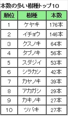 本数が多い木の種類ではケヤキとイチョウが群を抜いている