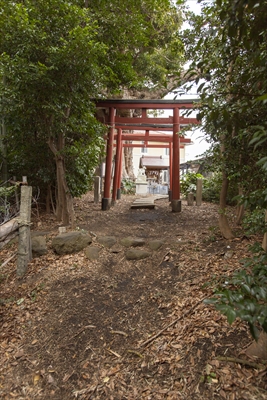 民家の間の細い道を入る。左右を木々や竹に囲まれた土の小路をたどっていくと鳥居が見えた。