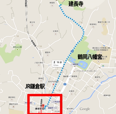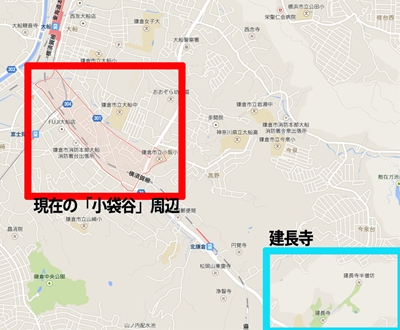 建長寺と「小袋谷」、JR北鎌倉駅・大船駅との位置関係