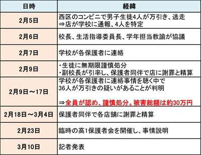 2月9日から17日(火)にかけて学校側が独自の聞き取りを行ったところ、この4人のほかに1年生32人が万引きをしたことがあるという事実を認めたため、全員に謹慎処分を科した。結果として1学年245人のうち、14.6%に当たる36人が謹慎という異常事態となった。