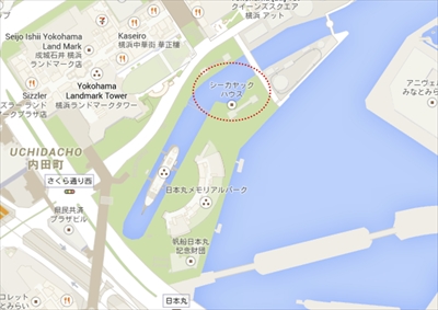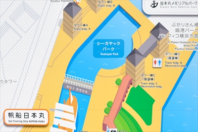 地図の「帆船(はんせん)日本丸」の上に