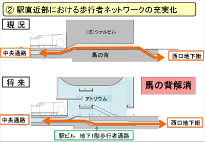 「2020年の東京オリンピックへ向けて『西口駅ビル(仮・元CIALがあった場所にできるビル)』を作る工事と『馬の背』のバリアフリー化の工事をすることが決定しています。新聞記事にもあった通り全体調整は横浜市が行いますが、駅ビルはJR、西口地下街は相鉄アーバンクリエイツが工事を担当、費用の負担をします」