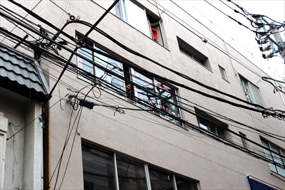 雑居ビルの窓からこちらに手を振るお姉さん。