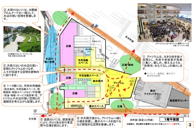 1階は、みなとみらい線馬車道駅を経由して隣接する「横浜アイランドタワー」と直結させ、市民だけでなく観光などで横浜を訪れた人が集えるアトリウムや水辺で憩える空間を整備。2階は市民協働スペース、情報提供スペースなどにして3階以上に市庁舎機能を置く。