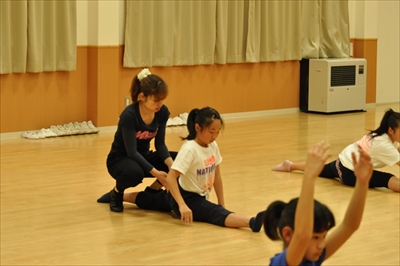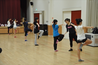 音楽が流れ、さっそく柔軟から練習がスタート(筆者:前列右から二番目)
