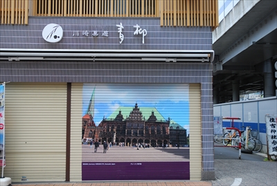 和菓子店「青柳」のシャッターにはブレーメン市庁舎
