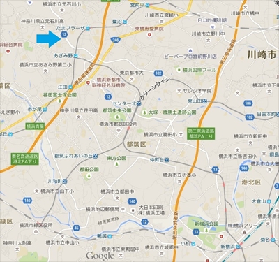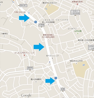 横浜市西区と川崎市多摩区を結ぶ県道13号線。横浜方面から進むと、港北ニュータウンの近くの「あざみ野駅入り口」の交差点のあたりから、4車線の広い道路が、中央分離帯から真ん中を川が流れる道路に姿を変える。その道路沿いに問題の橋はあった。