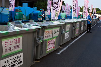 ゴミ用コンテナ横のノボリは資源環境局の「3R夢(スリム)」