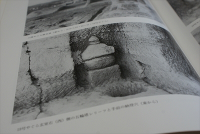 やぐらの中の五輪塔。手前の穴に土器に納められた遺骨を埋めた