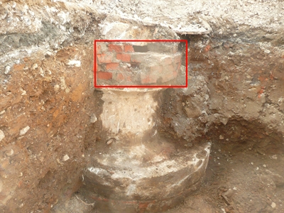 下水マンホールとみられる遺構。赤で囲った部分は積み足したレンガ
