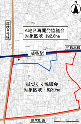 橋詰課長によると、最初に瀬谷駅南口再開発の動きがあったのは前述のように1991年。当時は「瀬谷駅南口街づくり協議会」として、瀬谷駅南口から厚木街道までの約30ヘクタール(30万平方メートル、横浜スタジアム11.4個分)が対象地域だった。