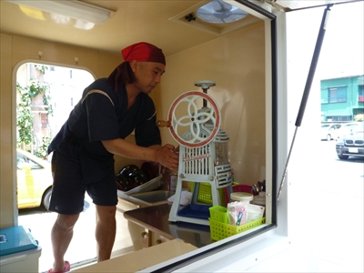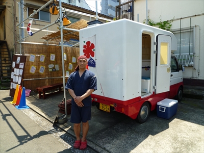 ワゴン車で営業するというなんとも個性的なお店だが、そのワゴン車の中を覗くとさらに個性的な甚平姿の男性がいた。