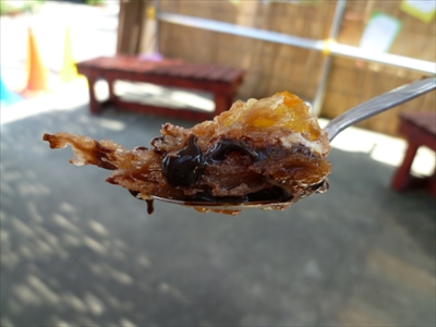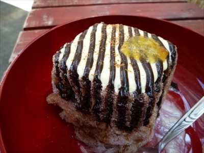 柑橘類の皮(ピール)を砂糖漬けにし、チョコで包んだフランスのお菓子「オランジェット」をイメージしたこのかき氷。シナモン、コーヒー、チョコ、オレンジなど、さきほどの梅干しかき氷と比べて複雑な味。氷のケーキというだけあって洋菓子のようだ。