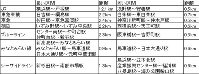 最も長いのがJR東海道線横浜駅~戸塚駅間の12.1km。最も短い区間は鶴見線浅野駅~安善駅など3ヶ所で500メートル。