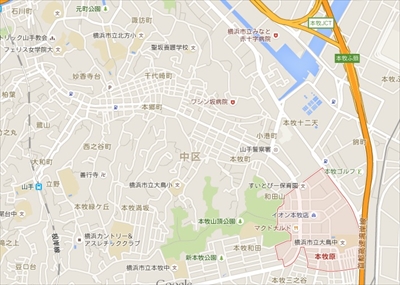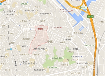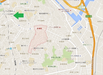 元町と本牧原の間あたりに本郷町がある。緑の矢印は麦田トンネル