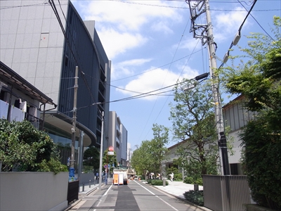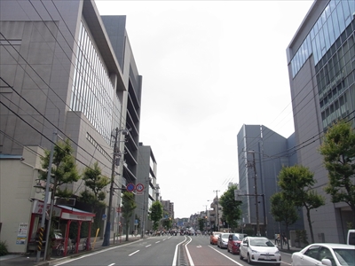 道路沿いにはマンションなどのビルは建っているが、このあたりには趣の異なるオフィスビルのような建物が、道路の両側に並んでいることに気づく。