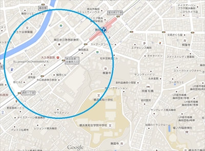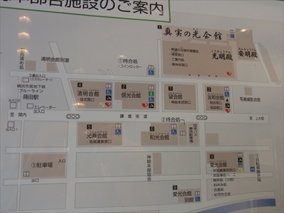 伊勢佐木町方面を背にして、鎌倉街道沿いの左側には、清明会館、信光会館、望会館、友和会館が並ぶ。一本奥の道路に入ると、道路沿いに真実の光(みち)会館という広い敷地を持つ施設がある。そのほかにも清明会館別室などの小規模な施設も建っている。