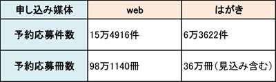 6月19日から7月21日までインターネットとはがきで購入希望の申し込みを受け付けた結果、総応募件数は21万8538件。一人10冊まで購入可能なため、応募冊数は約130万冊だった(2015〈平成27〉年7月24日時点。はがき分が未集計のため、見込み値を含む)。