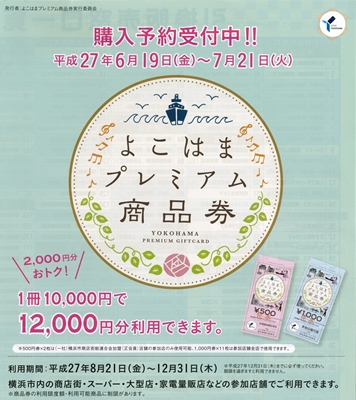 横浜市が発行する20%の割り増し(プレミアム)が付いた「よこはまプレミアム商品券」が8月21日(金)から利用可能になる。1冊1万円で、1万2000円分使える。横浜市と横浜商工会議所、横浜市商店街総連合会で組織した実行委員会による合同事業で、使用期限は2015年12月31日(木)まで。